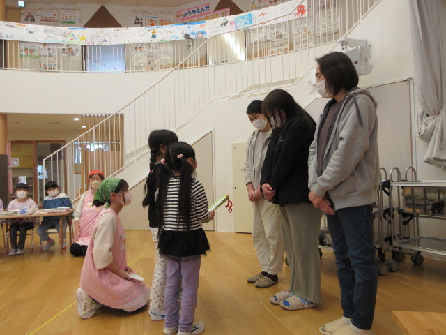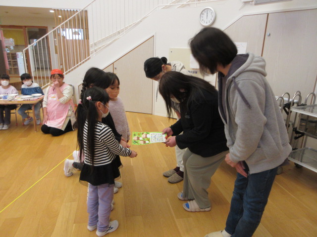 栄養士さんからメニューを紹介して頂いた後、給食室の先生方に感謝の気持ちを伝え、プレゼントを渡しました。