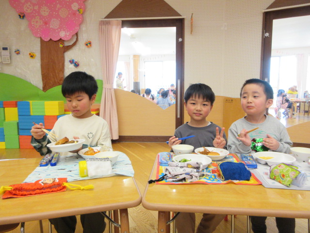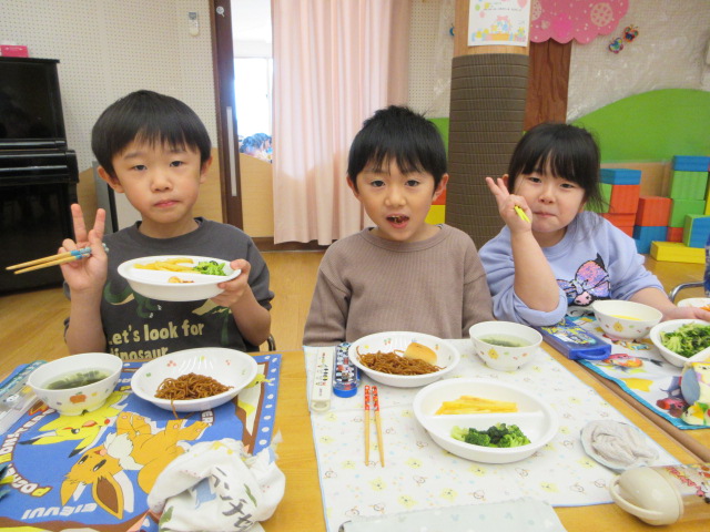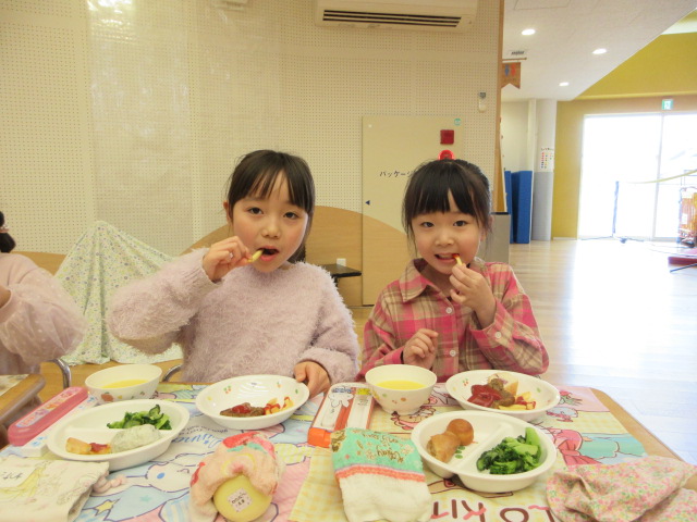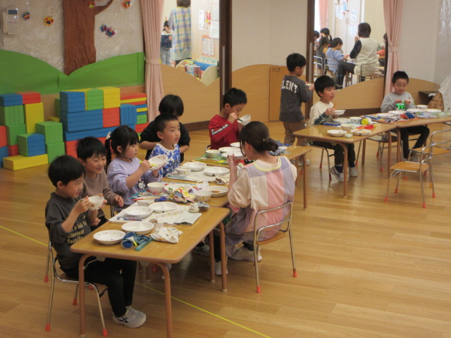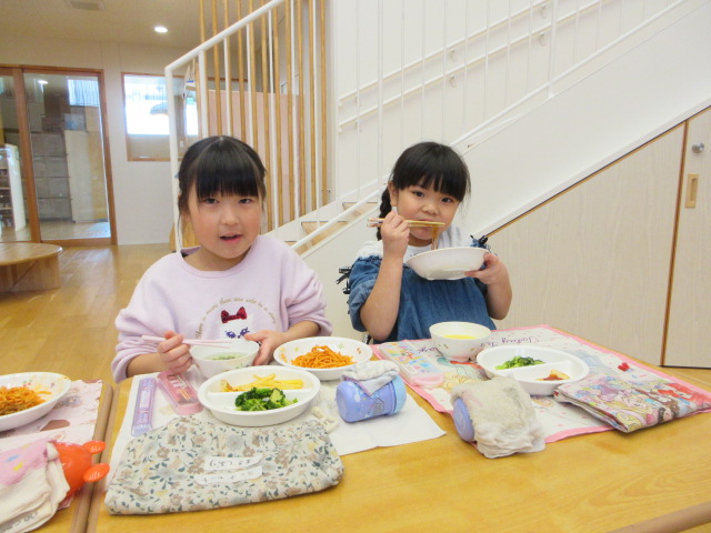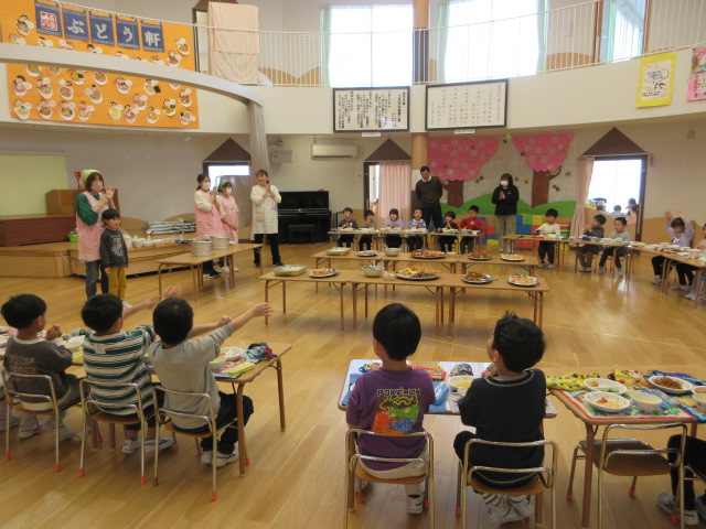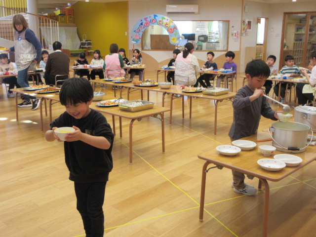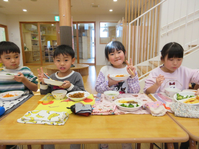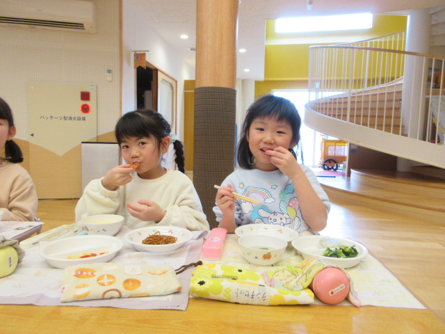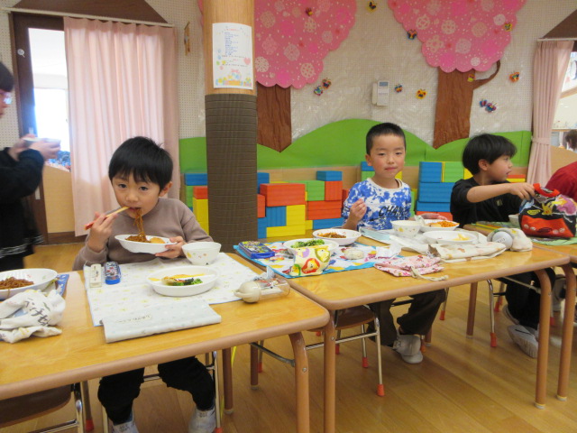 「おいしいね」と大満足の子ども達。お友達や先生とお話ししながら楽しく会食!