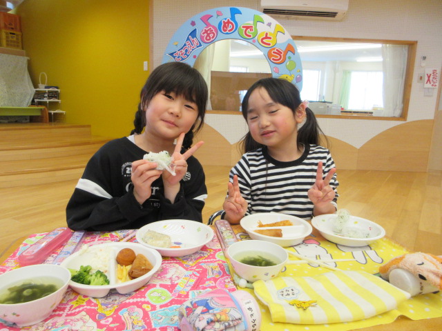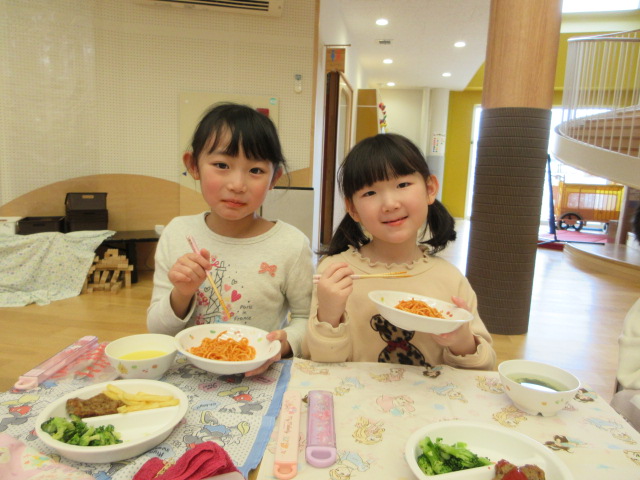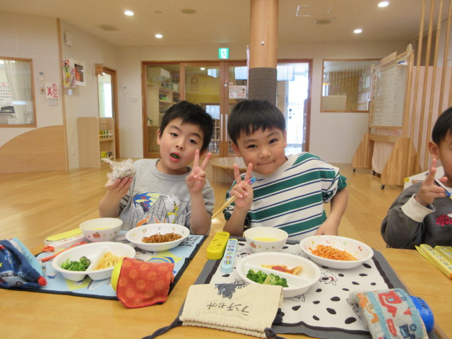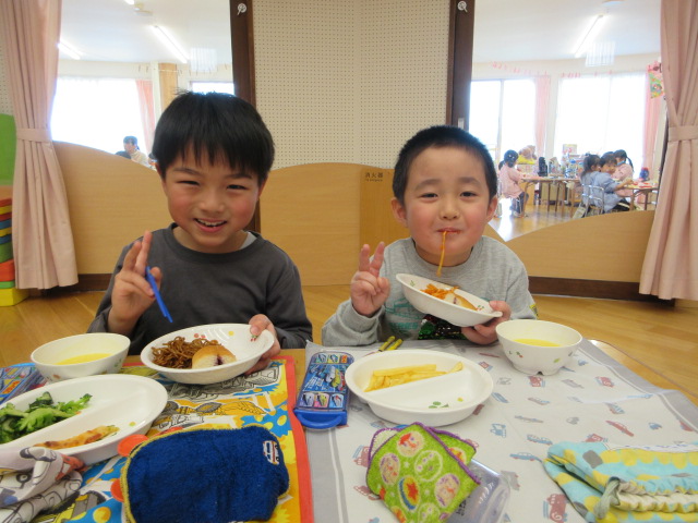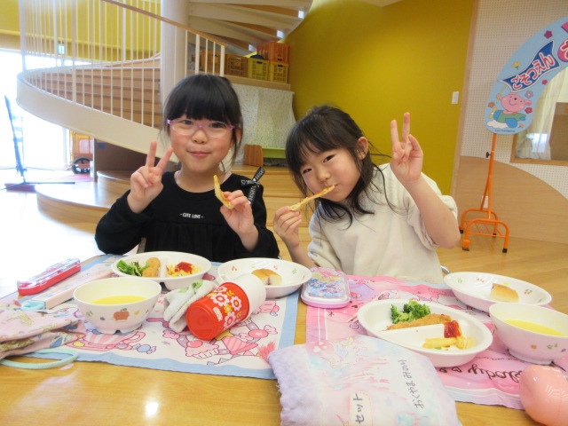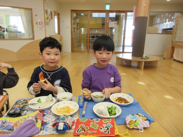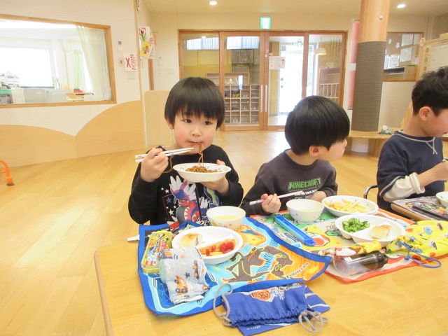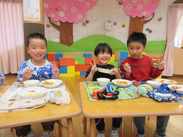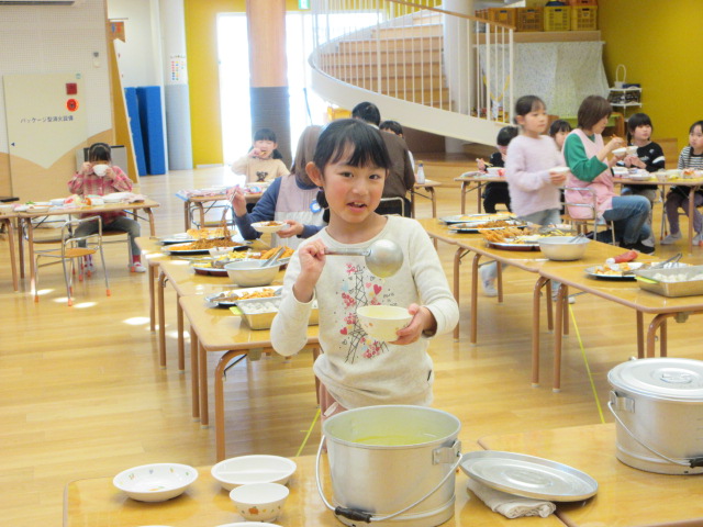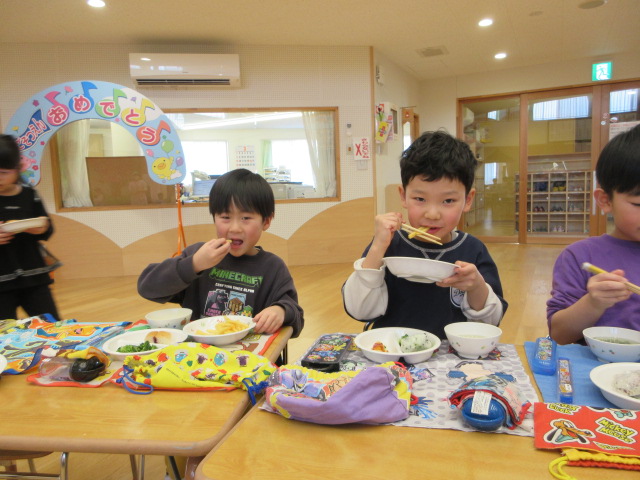 「おいしいね」と大満足の子ども達。お友達や先生とお話ししながら楽しく会食!