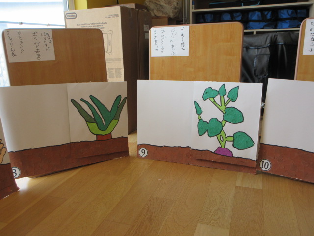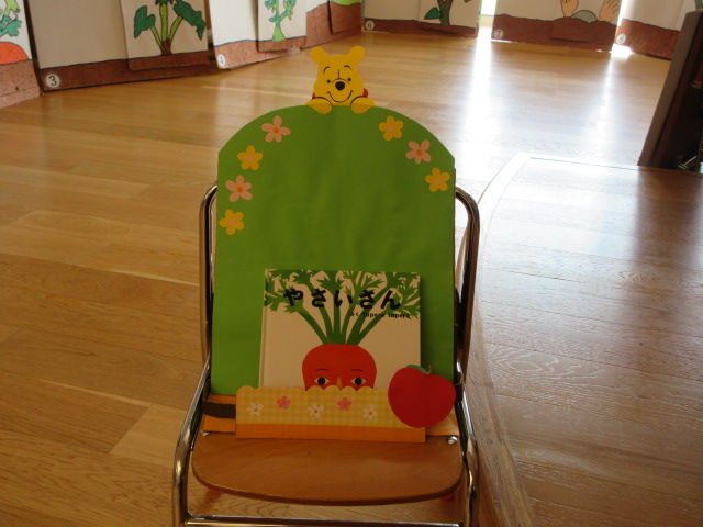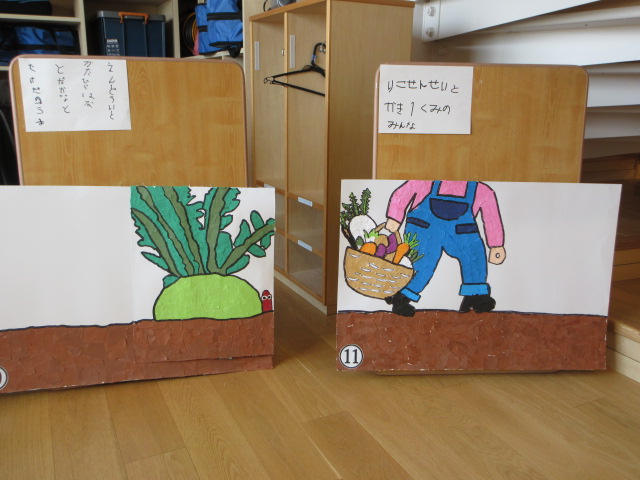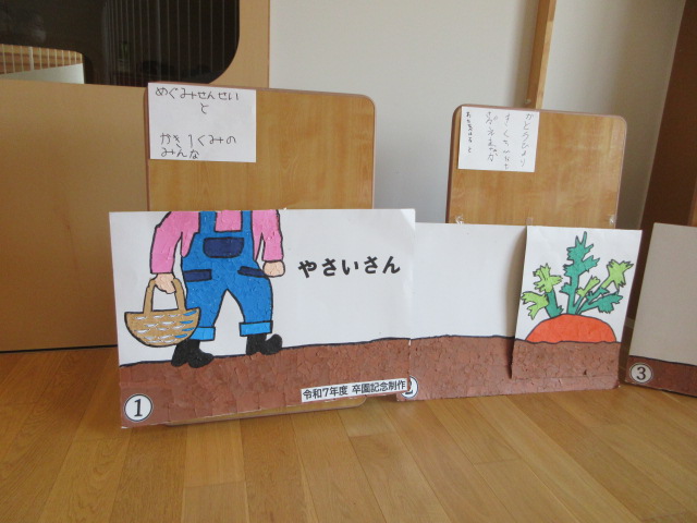 ホールに飾られた卒園記念作品・大型紙芝居「やさいさん」仕掛け紙芝居。先日のお別れ会でお披露目!とてもステキなお話です。大切に使わせていただきます。