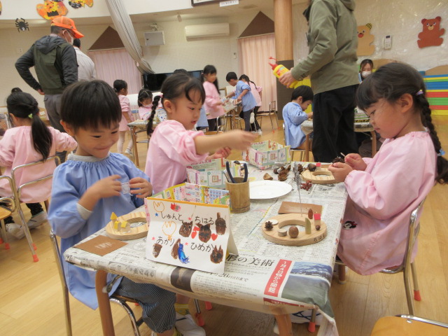 ぶどう組がリースを作りました。講師はNPO法人美しいやまがた森林活動支援センターの皆さんで、一人ひとりにていねいにかかわって下さり、自然物の魅力と森林資源の大切さを教わりました。