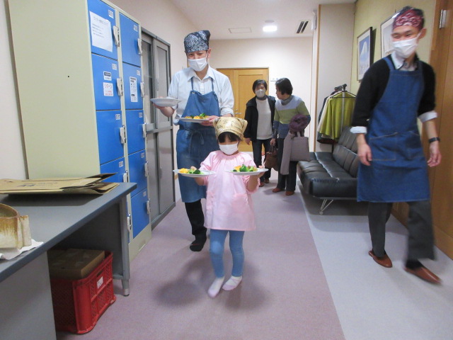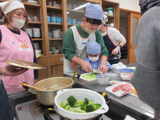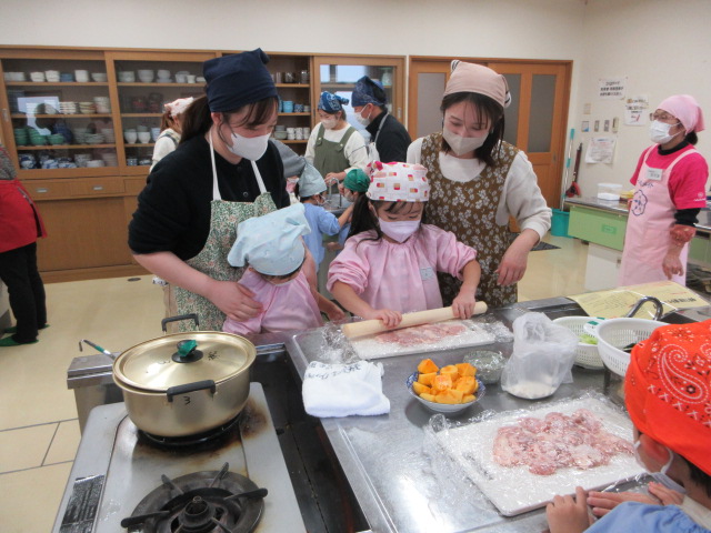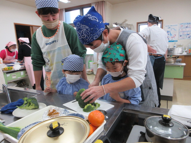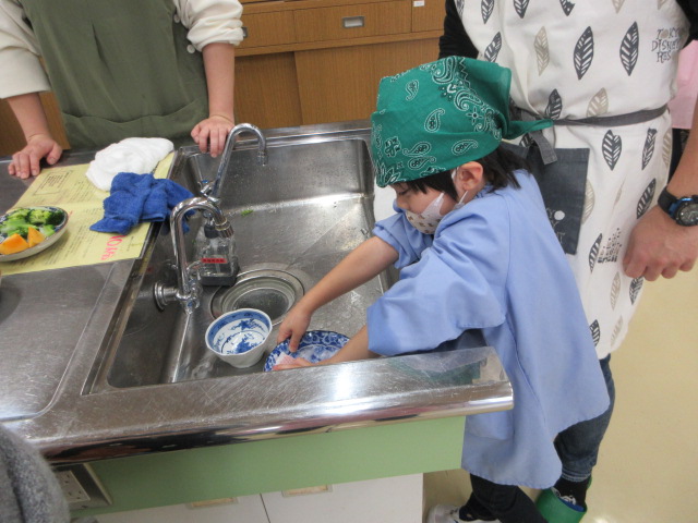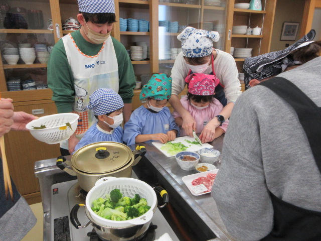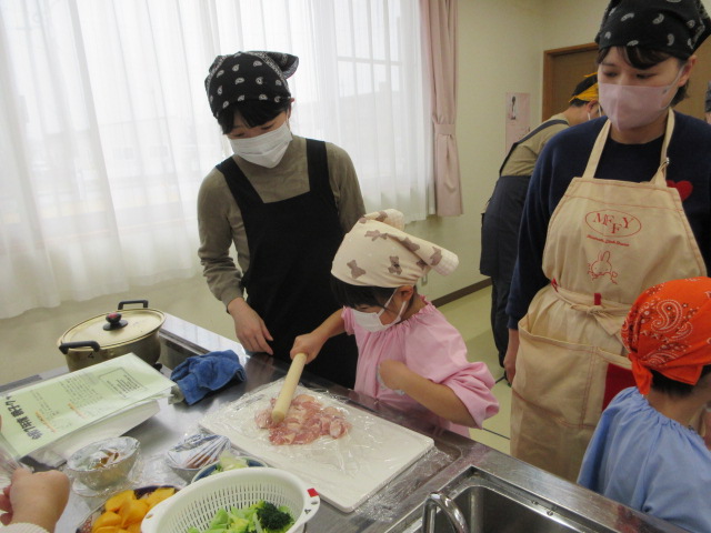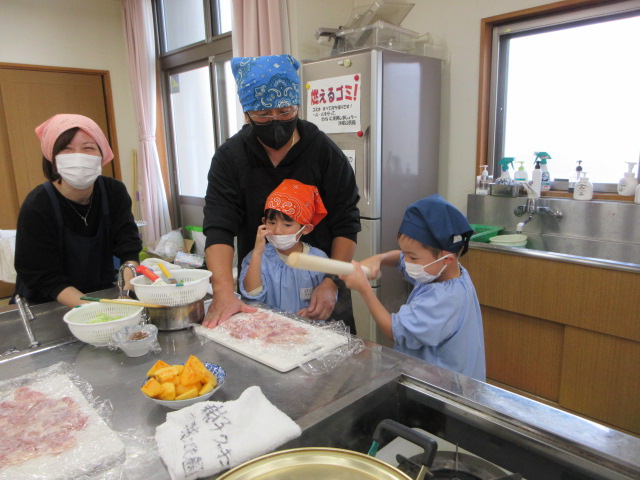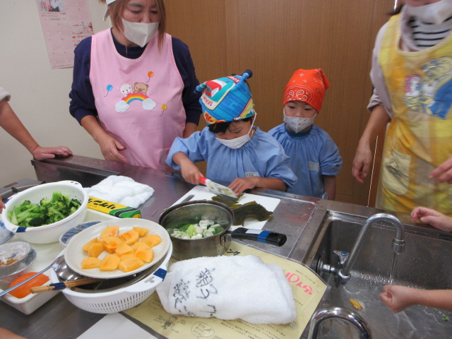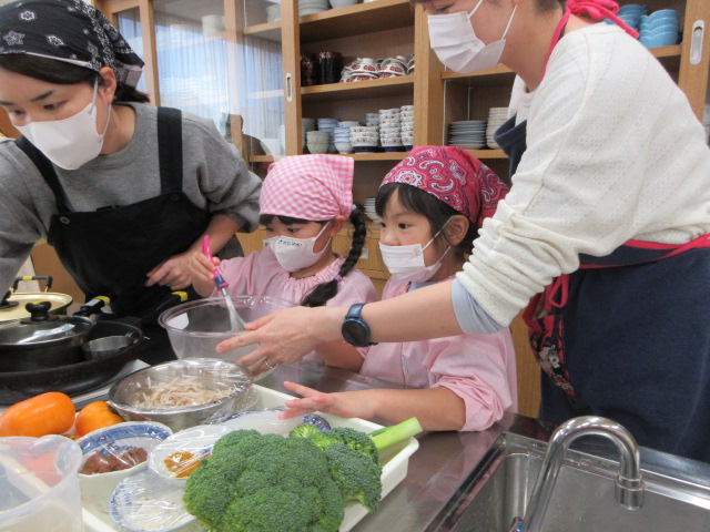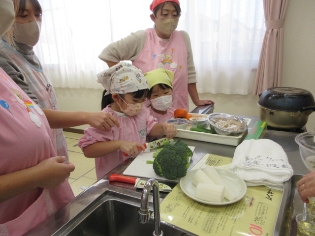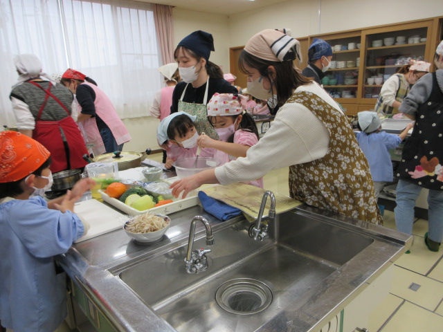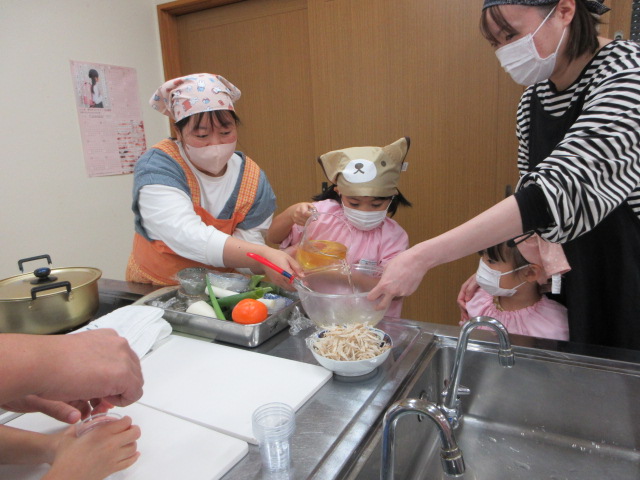 栄養士さんから教えていただき野菜を洗ったり、切ったり、とり肉を焼いたりみんなで楽しく作りました。