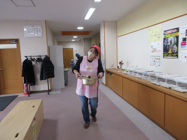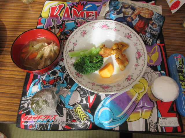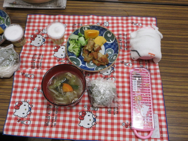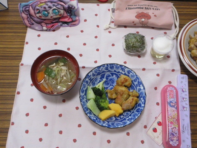 ニューは、☆ぎゅっぎゅっと!おにぎり ☆とり肉のカレーソテー ☆豚肉入り根菜汁 ☆そっくり!ビール風ぜりー