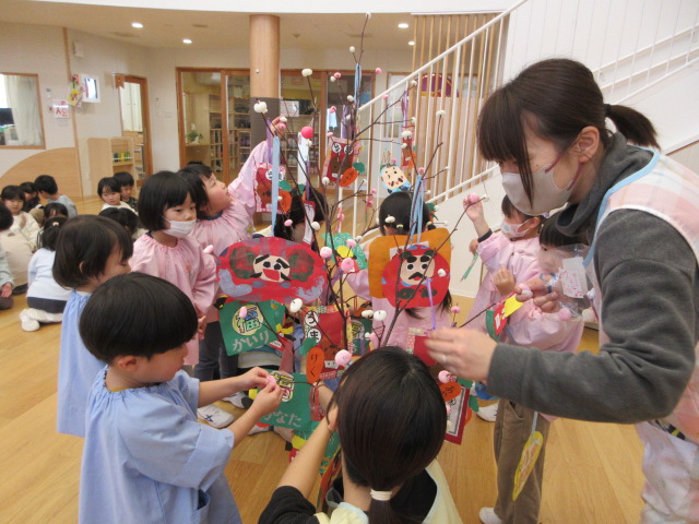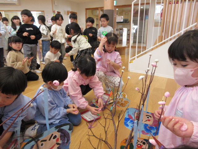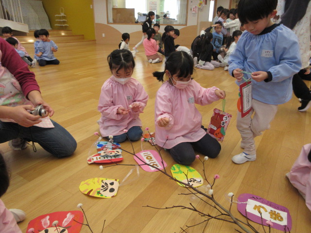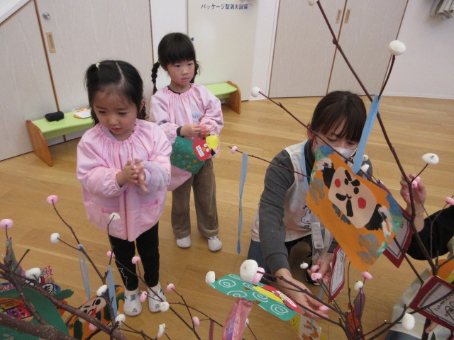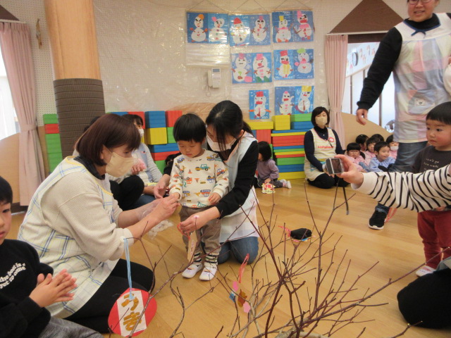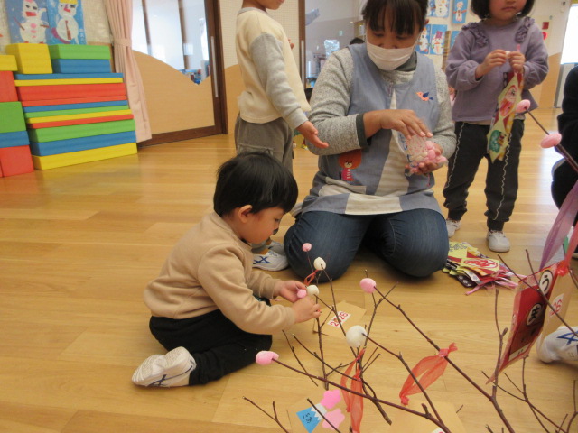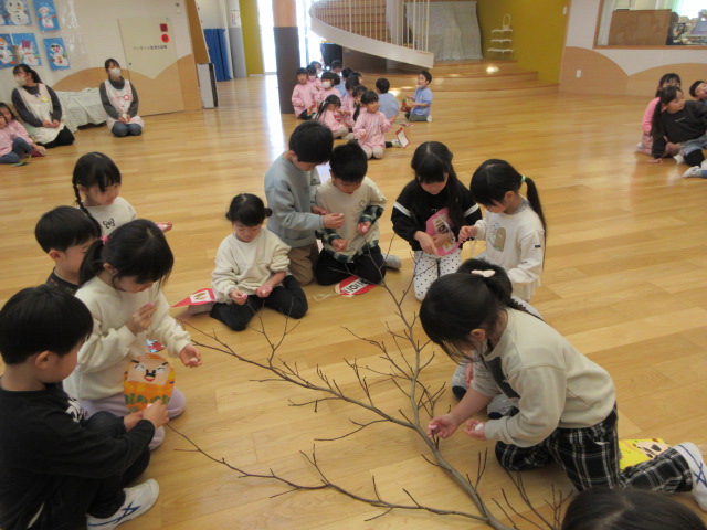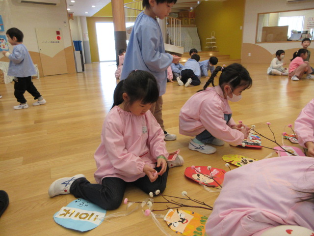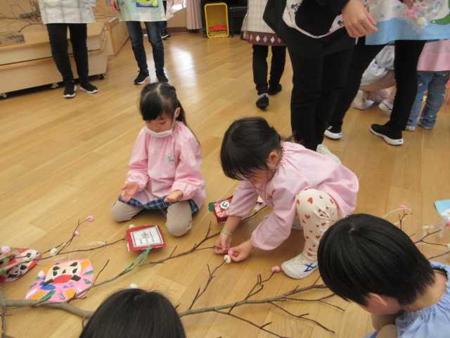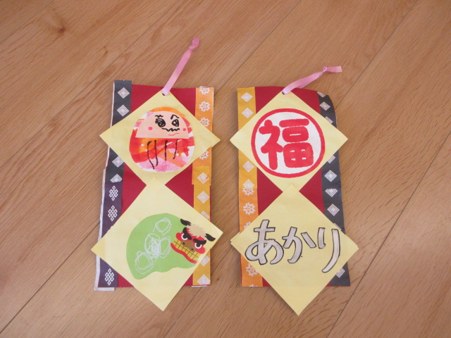 2歳児もも組 「めでたい物をギュギュっと詰め込んだ飾りをつくりました」