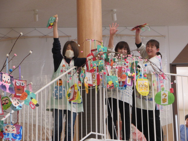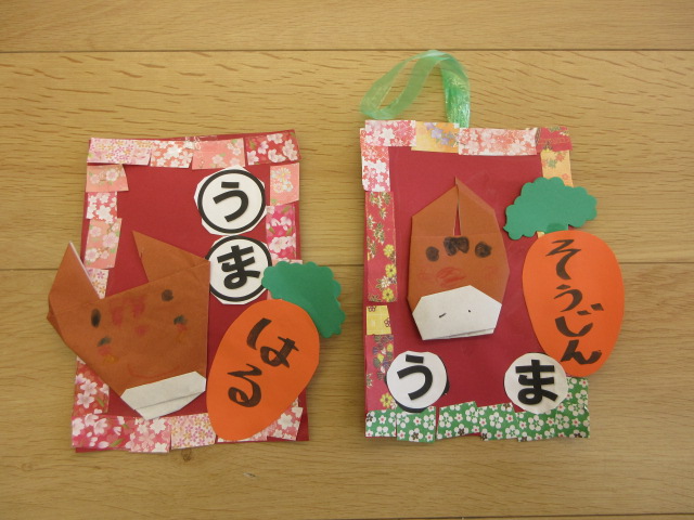 年中ぶどう組 「かるたをモチーフで作りました。馬もがんだっておりました。裏には馬にちなんだ文章を入れました。」