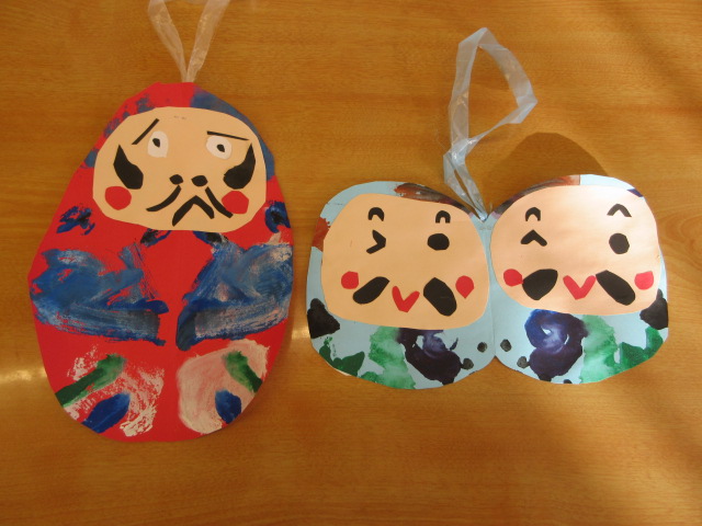 年長かき組 「デカルコマニーでだるまをつくりました。裏には「うま」「2026」「令和8年」の中からすきな文字を選び切りばりをしました。」