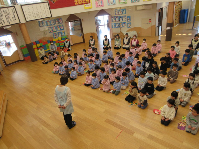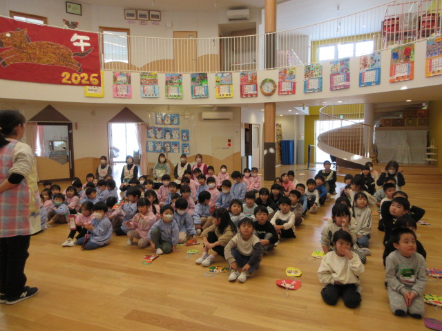 園のホールに、色とりどりの作品を持って子ども達が集まりました。