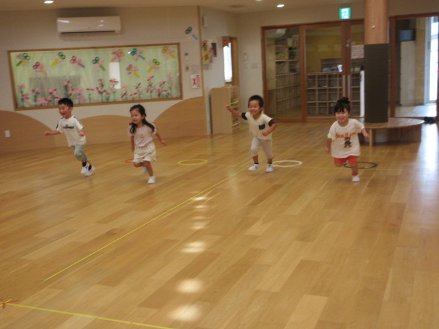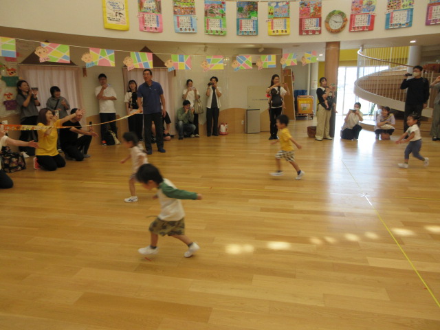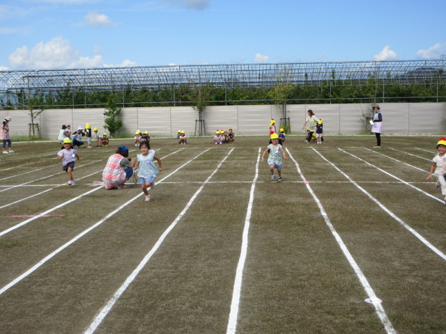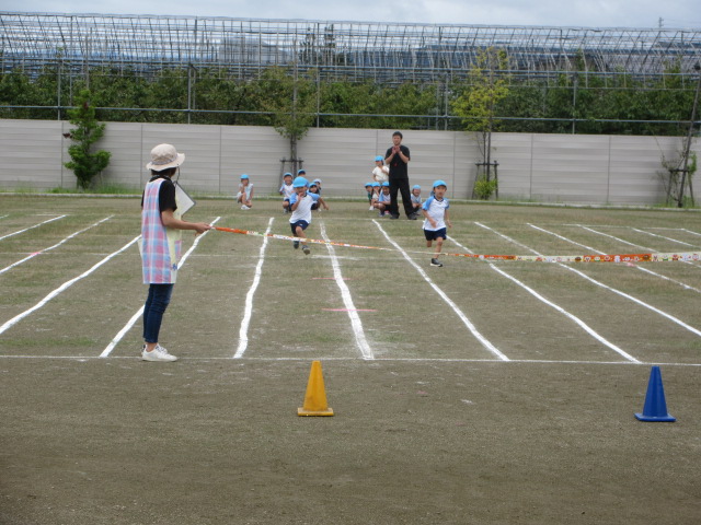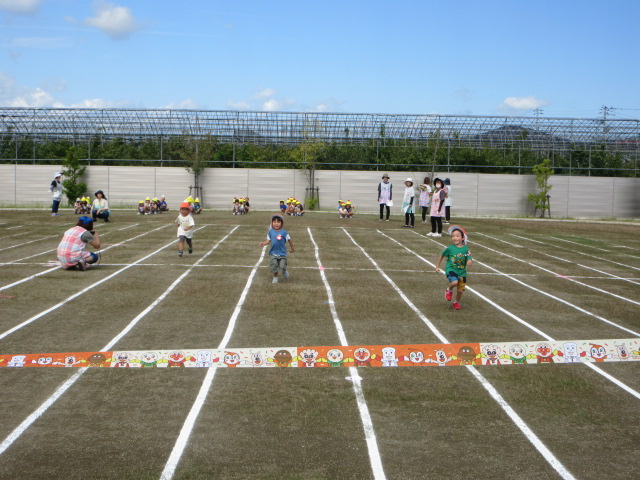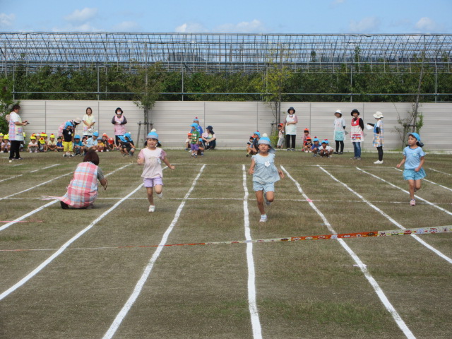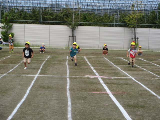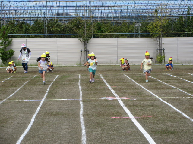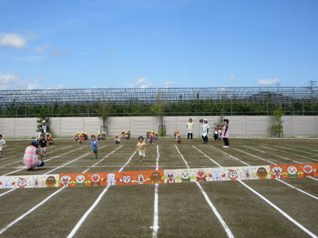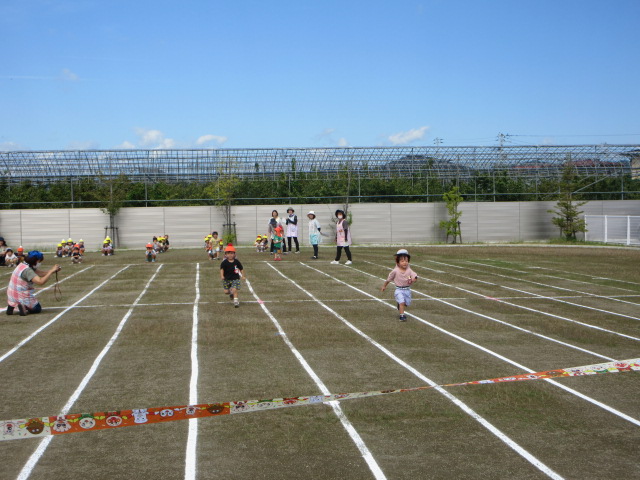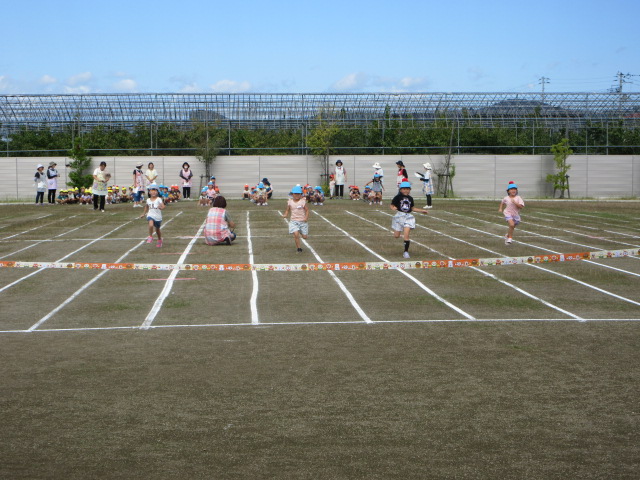 もも組 かけっこ 「それいけ!もも組!みんなでよーいドン‼」一生懸命走る姿は世界陸上の決勝のようでした。