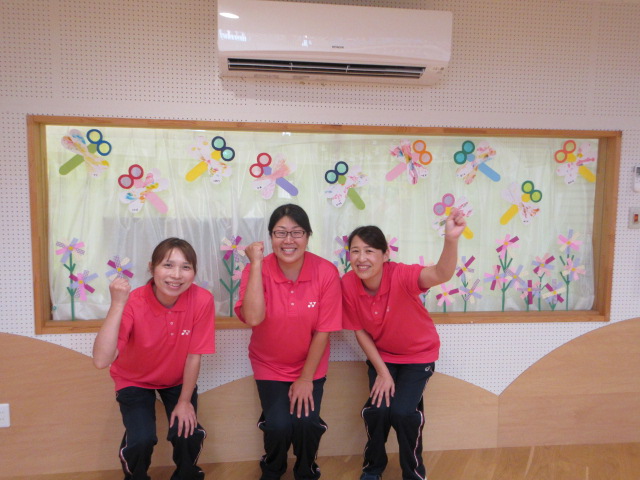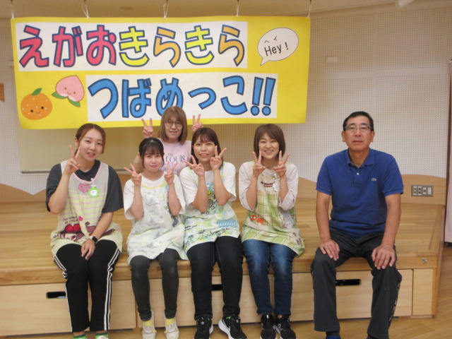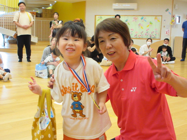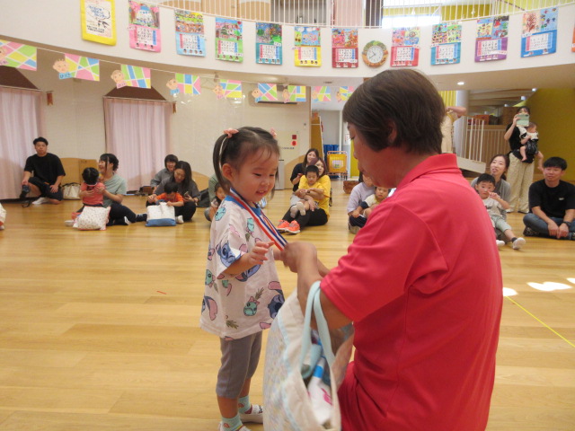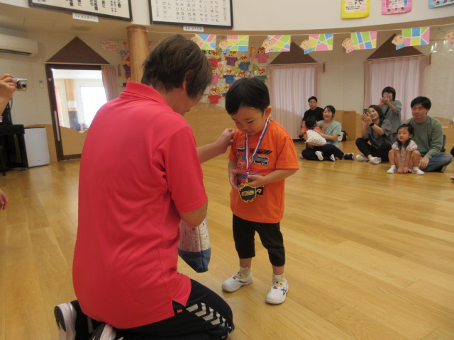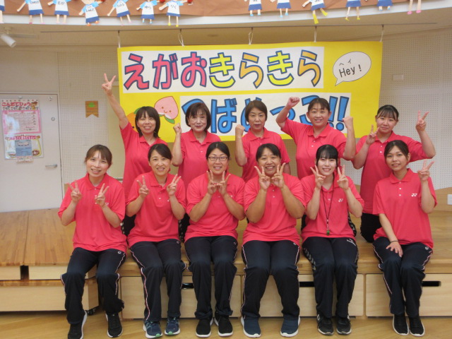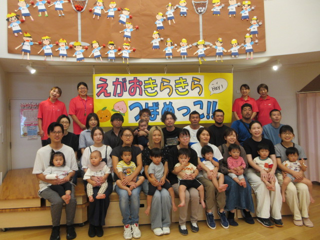 みかん組にとっては初めての運動会、もも組さんは初めてのお友達と2回目のお友達。担任の先生も笑顔いっぱい!